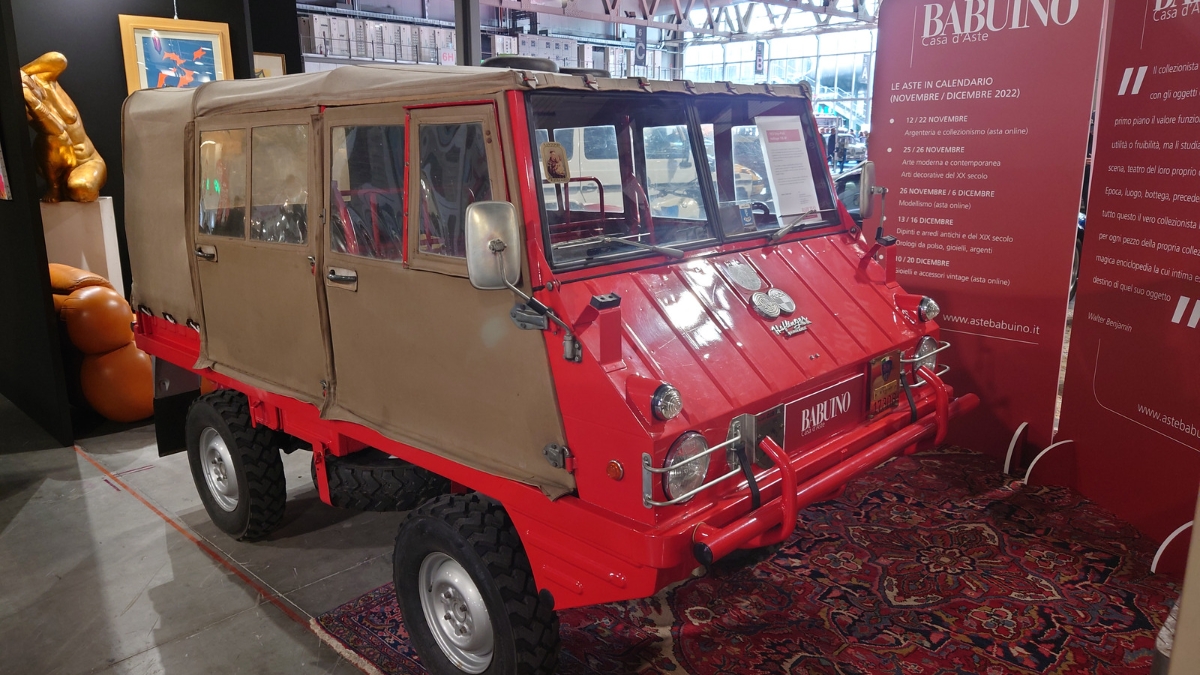In rosso, invece, brilla lo Steyr-Puch 700 AP Haflinger, strano camioncino prodotto dal 1959 al 1974 dal gruppo austriaco Steyr-Daimler-Puch come veicolo per l’esercito di Vienna. Ha un piccolo bicilindrico Boxer di 643 cm3 e trazione integrale, con velocità massima di ben 12 km/h. Il telaio è leggero, le porte in tela per la massima praticità e il minimo ingombro. Venne usato anche dalle Forze Armate Elvetiche e dall’esercito del Congo Belga.