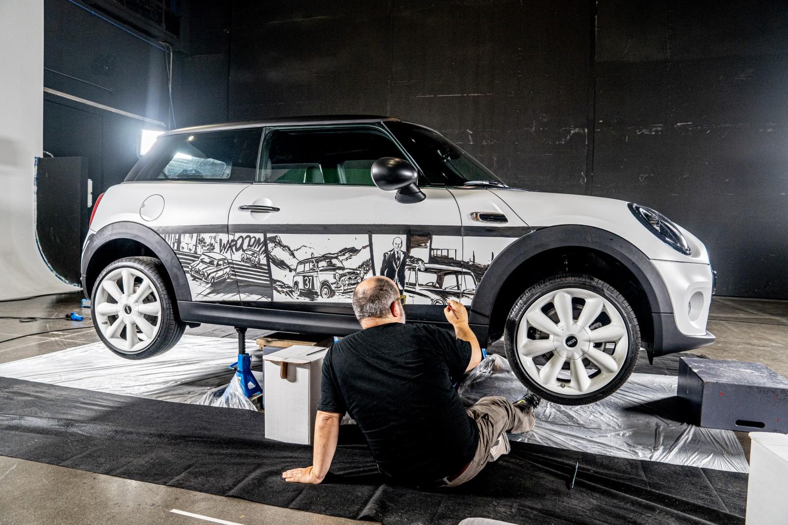 La performance ha dato vita a un’opera assolutamente unica. Le strisce a fumetti che avvolgono l’auto ripercorrono i più iconici momenti della storia di Mini. La storia inizia sulla fiancata destra, con il ritratto di Alec Issigonis, il padre della piccola britannica, per passare poi agli eroici successi di Mini nel Rally di Monte Carlo e alla citazione degli acrobatici inseguimenti della pellicola “The Italian Job”, una delle innumerevoli apparizioni cinematografiche che hanno visto Mini protagonista.