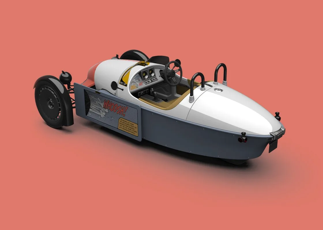Whoosh Bang Pop: questa versione si ispira alla vibrante applicazione di colori a blocchi del movimento della pop art, emerso nel Regno Unito e negli Stati Uniti durante la metà e la fine degli anni Cinquanta, con grafiche d’impatto e narrazioni giocose trasposte in un’accattivante striscia di fumetto applicata ai pannelli della carrozzeria in alluminio della Super 3. Il tutto sovrapposto a una combinazione di vernice bicolore Heron Grey e Belfast Blue.