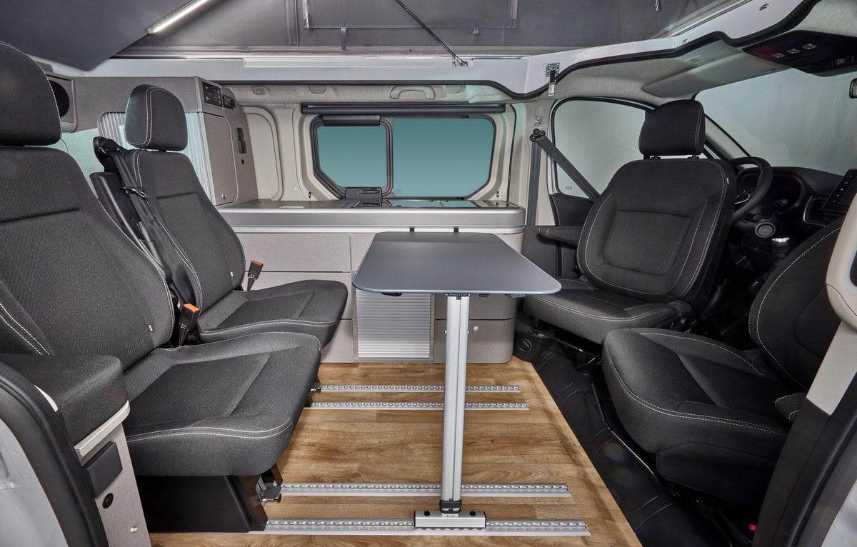 Il nuovo camper è stato pensato per offrire tutti i comfort di casa ed è caratterizzato da una cabina molto versatile. I sedili sono in tutto sei, di cui i due anteriori orientabili e i restanti quattro che possono essere posizionati o rimossi individualmente senza l’uso di attrezzi. Un tavolo regolabile, un frigorifero da 36 litri, una cucina a gas con due fornelli e un set di armadietti creano un ambiente comodo e pratico al momento dei pasti.