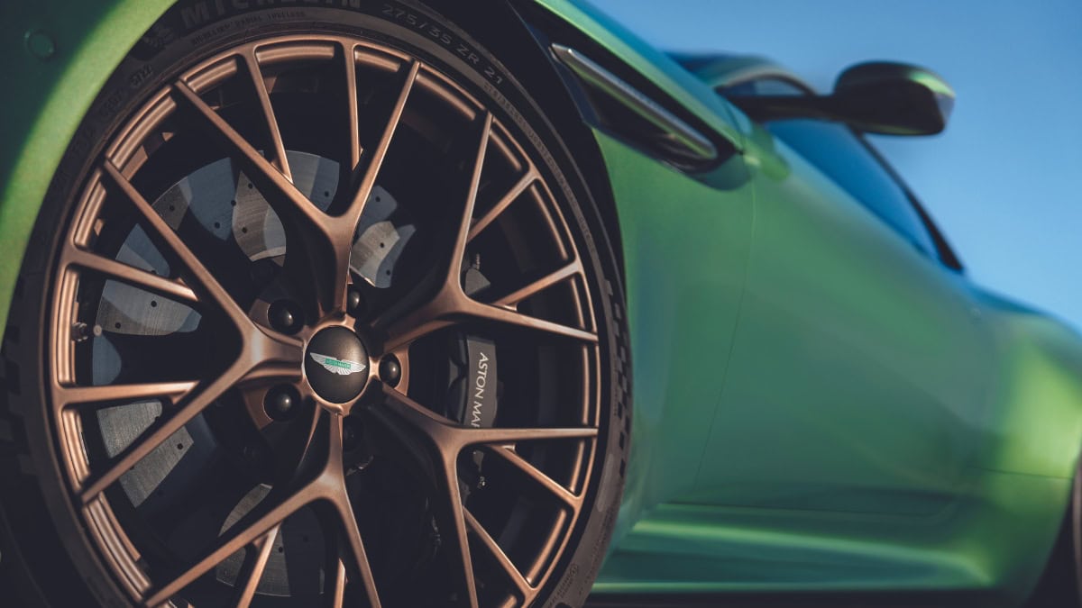 Ad accentuare la sua natura, la nuova Aston Martin DB12 ha come optional anche freni carboceramici, certo in grado di aumentare le prestazioni di frenata e ridurre il fading a temperature fino a 800°C, oltre a risparmiare 27 kg di massa non sospesa rispetto ai freni di serie. Inclusi invece i cerchi in lega forgiati da 21” 9.5J anteriori e 10.5J posteriori, di serie a 5 razze o optional multirazza o razze a Y, con diverse colorazioni e finiture. Si tratta di cerchi molto leggeri, al quale l’azienda ha lavorato molto per arrivare alle massime prestazioni senza rovinare l’estetica.