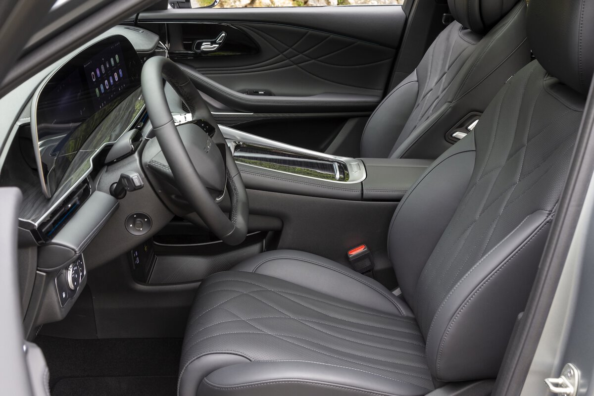 Il sedile del conducente è elettrico, ventilato, riscaldato e massaggiante, con memoria e supporto lombare regolabile. Anche il volante è regolabile elettricamente, ma la corsa in profondità è limitata e potrebbe rappresentare un limite ergonomico per i guidatori più alti. Ottima, invece, la qualità percepita: pelle con impunture a vista, rivestimenti morbidi anche nei pannelli porta, e una particolare cura per dettagli come le maniglie a filo e il cielo dell’abitacolo in Alcantara o velluto, a seconda dell’allestimento.