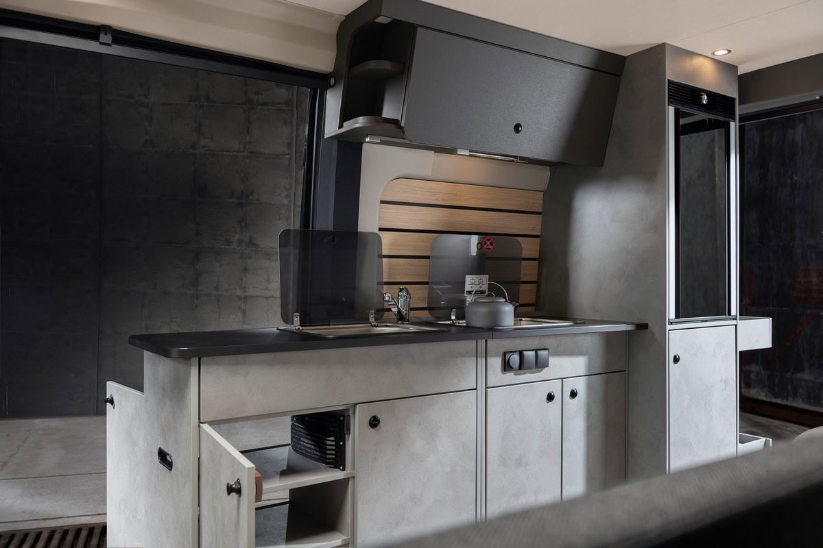 Il restante vano posteriore del Crosscamp 541 può essere utilizzato in modo flessibile, sia con un armadio con quattro scomparti che possono essere installati e rimossi rapidamente, sia con il divisorio doccia modulare delle stesse dimensioni. Il pratico angolo cottura si trova sulla parete laterale destra del veicolo. Il primo modulo di cottura con fornello a gas a due fuochi, armadio da cucina e spazio per bombole di gas da 2,8 kg e frigorifero da 70 litri, accessibile anche dall’esterno, è installato in modo permanente per garantire l’omologazione come camper. Il secondo modulo cucina, invece, può essere rimosso tramite l’anta scorrevole. Contiene il lavello con rubinetto fisso e i serbatoi delle acque dolci e reflue e può essere utilizzato anche come cucina da esterno se necessario.