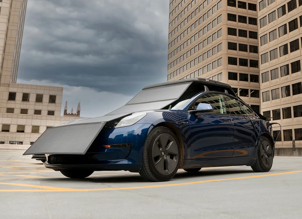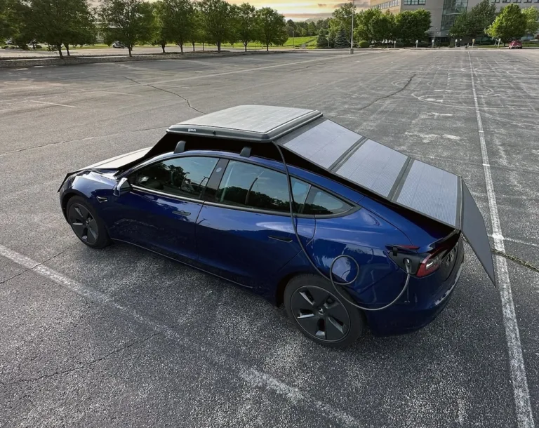 Durante il movimento, il sistema offre una carica nominale di 200 watt. Ovviamente, il vero potenziale si manifesta quando l’auto elettrica è parcheggiata. Aprendo il box, il conducente può srotolare una serie di pannelli solari, aumentando la capacità totale a 1.200 watt. Collegando il cavo di uscita da 120 volt direttamente alla porta di ricarica dell’auto, si ottiene una ricarica direttamente dal sole. GoSun garantisce che i pannelli possono rimanere aperti anche con venti fino a 50 km/h, mentre il box chiuso è progettato per resistere a velocità autostradali fino a 160 km/h.