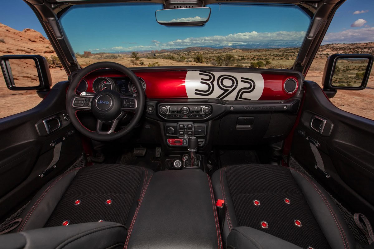La carrozzeria, verniciata con un’intensa colorazione Poison Apple Red, è stata snellita grazie alla rimozione delle maniglie delle porte posteriori, al cofano in carbonio personalizzato con power dome trasparente e allo sportello di rifornimento del carburante in stile racing, integrato nel pannello posteriore lato guidatore. Gli interni sono caratterizzati da sedili in pelle nera personalizzati con inserti in tessuto, pavimenti rivestiti in Rhino e un quadro strumenti su misura e privo di radio. Il bikini top, realizzato appositamente, diffonde nell’abitacolo una calda luce rossa. Il concept Jeep Low Down è alimentato da un motore V-8. In questa interpretazione moderna, si tratta del propulsore 6,4 litri 392 V-8 da 475 CV, abbinato a un cambio automatico a otto velocità.