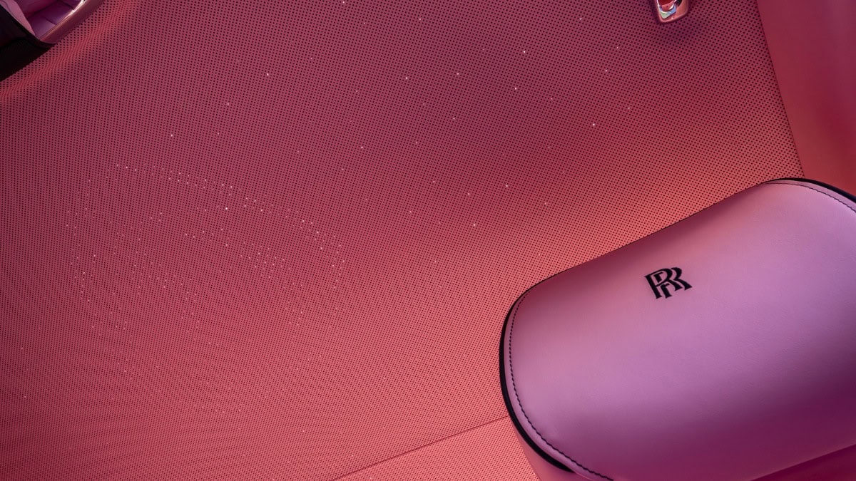 Tutto, in quest’auto, è rosa. E tra l’altro, tutto ha richiesto tempo: l’azienda ha dichiarato che la cliente ha passato ben 4 giorni ad analizzare la gamma di auto Rolls-Royce, componendo poi una sorta di moodboard con centinaia di campioni di colore inviata al reparto su misura, ridotto poi a 30 campioni e infine scegliendo il colore finale, rosa.