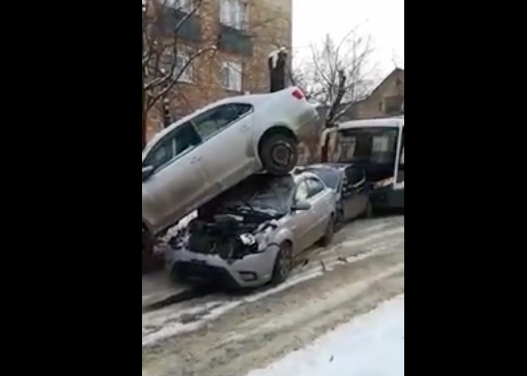 E’ successo in Russia, dove causa fondo innevato, in una piccola strada si è registrato un grande tamponamento a catena.