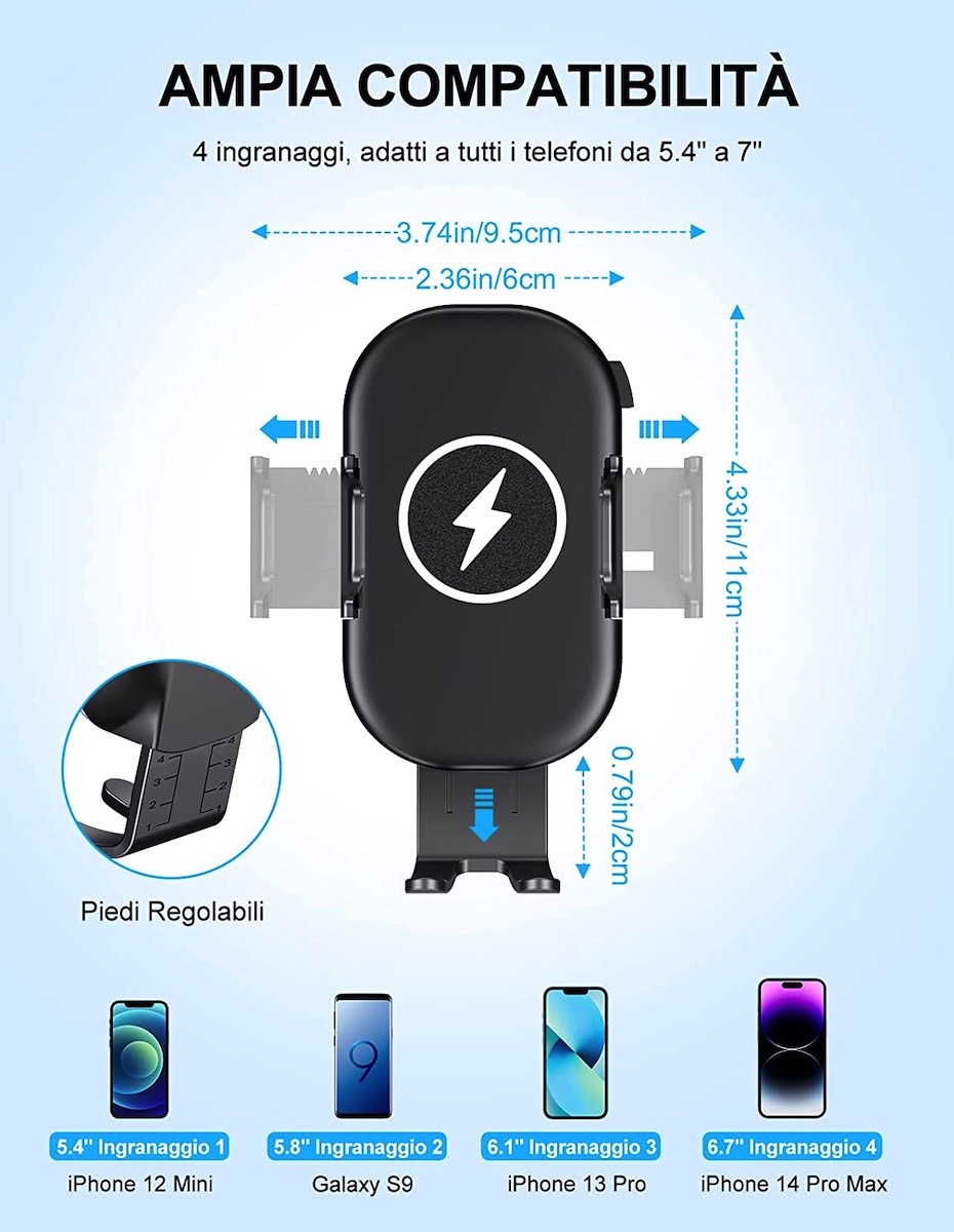 L’alimentazione viene effettuata con il cavetto USB-C in dotazione mentre dal punto di vista tecnico, la ricarica si adatta in un range compreso tra 5 e 15 W. Il ricarica wireless auto supporta Max 15W di ricarica veloce compatibile con LG G7 ThinQ e Huawei, Max 10W di ricarica veloce compatibile con Galaxy, Max 7.5W di ricarica veloce compatibile con iPhone. E’ compatibile con tutti i telefoni cellulari abilitati Qi. La ricarica veloce 15W/10W/7.5W richiede il caricatore da auto QC 3.0 (incluso).