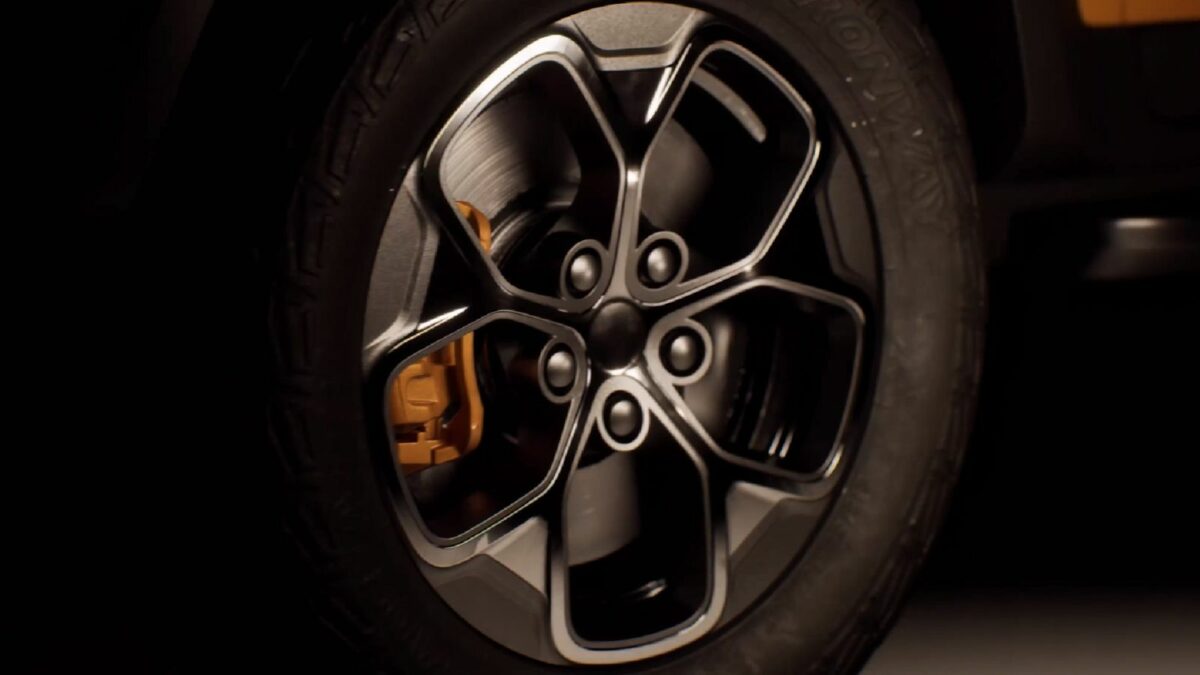 Abbiamo qui un fuoristrada di chiara ispirazione Jimny, con sbalzi corti, sospensioni rialzate, passaruota massicci e specchietti retrovisori sovradimensionati. È presente un robusto portapacchi e l’auto teaser è rifinita con una bella vernice bicolore.