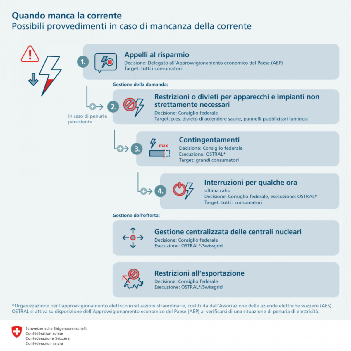 Il consiglio federale svizzero ritiene allora poter ricorrere ad appelli urgenti per economizzare l’energia elettrica. Si paventa di arrivare fino all’interruzione dell’erogazione in alcune zone, onde evitare un black-out. Piccoli vademecum per le emergenze sono già stati pubblicati in rete dal sito della RSI.