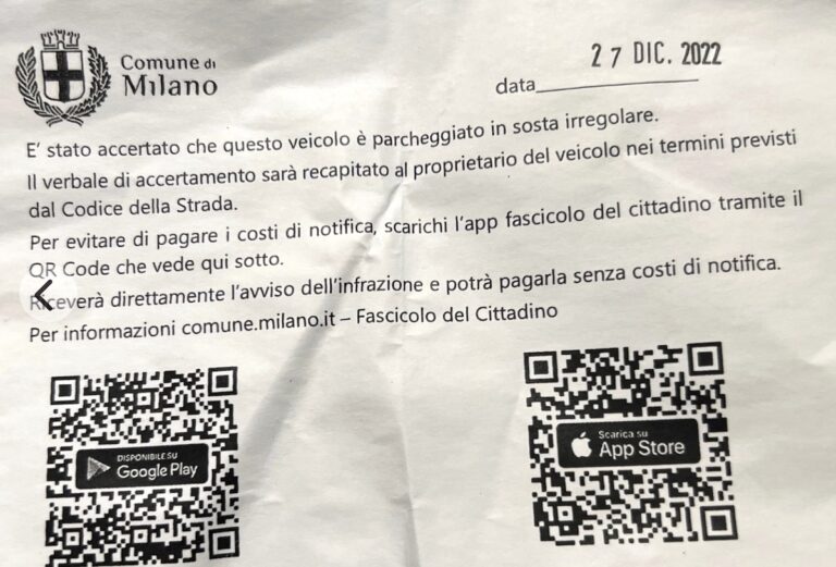 Si perchè come fanno notare i colleghi svizzeri di Ticino Online, da quando non c’è più il bollettino postale per pagare le infrazioni, le cose si sono fatte complicate, dato che viene messo sul parabrezza un bigliettino con due QR Code per scaricare un’app. Un sistema comodo per i cittadini italiani che possono fare tutto online, ma gli altri?