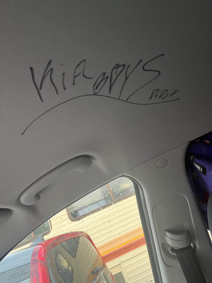 Nel caso delle immagini di oggi c’è pure la “rivendicazione”, con la firma lasciata sull’aletta parasole e sul cielo dell’auto.