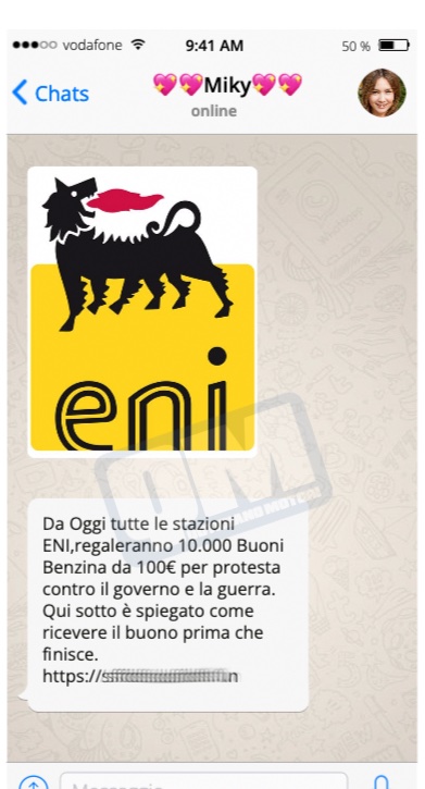 Il testo del messaggio con il buono ENI su Whatsapp recita testualmente: