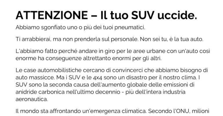 La loro simpatica idea è quella sgonfiare i pneumatici dei SUV per rendere impossibile possedere un “enorme 4×4 inquinante” nelle aree urbane del mondo. Sgonfiando un numero sufficiente di pneumatici di questi “veicoli massicci e inutili“, il gruppo spera di causare “disagi e spese per i proprietari” tali da indurre le persone a smettere di guidare veicoli di grandi dimensioni nelle aree affollate.