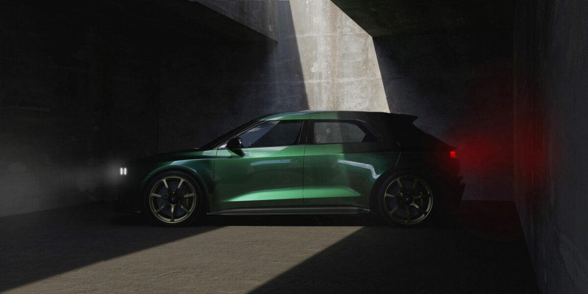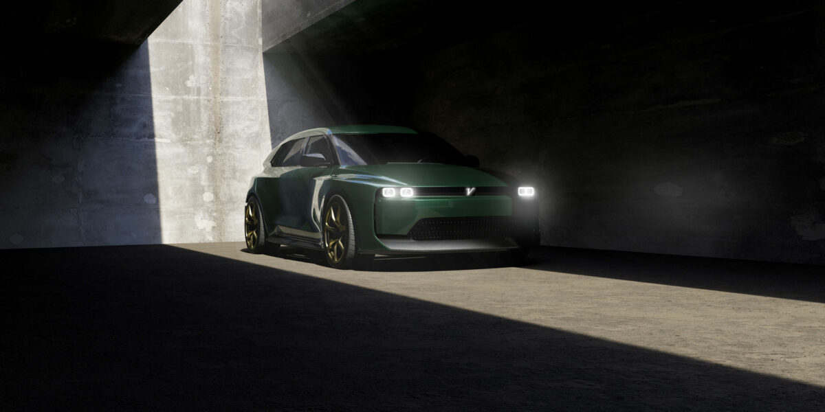 Si tratta di una due volumi a 5 porte, con forme aggressive dal sapore retrò, e numerosi dettagli aerodinamici. Il look sportivo è sottolineato dal grande splitter anteriore in fibra di carbonio, dallo spoiler posteriore, dalle minigonne laterali. Spicca poi la linea dei finestrini “tagliata”, con montante posteriore spesso, e il colore verde classico che richiama le origini inglesi di Vanwall.