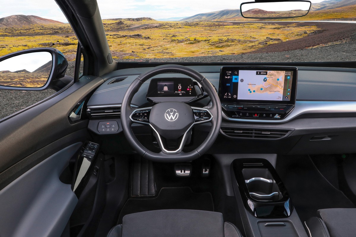 I colori dominanti negli interni sono il nero e il Platinum Grey, mentre i sedili sono rivestiti in tessuto Matrix. I pedali in acciaio inossidabile si presentano nel design Play & Pause tipico dei modelli ID., mentre le luci soffuse interne possono essere regolate su dieci colori. A richiesta vengono offerti due interni Style, con i quali i fianchetti, i pannelli delle porte e la parte superiore della plancia vengono realizzati in un secondo colore. Le due opzioni si chiamano Florence Brown (con volante e piantone dello sterzo in nero oppure in Electric White) e Platinum Grey (con volante in nero). Gli interni Style comprendono cuciture in contrasto sulla plancia, finiture cromate sulle bocchette dell’aria, il volante riscaldabile rivestito in pelle e il bracciolo posteriore.