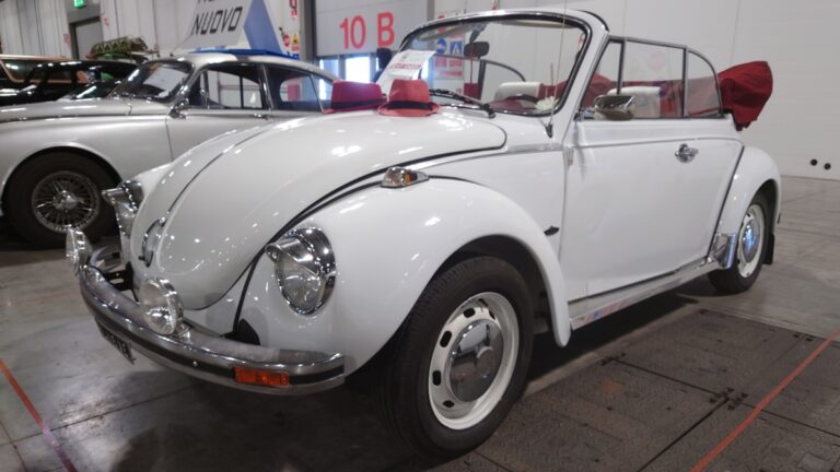 Pronto per viaggiare, a Milano AutoClassica 2022 si fa ammirare un Volkswagen Maggiolone Cabrio Karmann perfettamente restaurato, almeno in apparenza, immatricolato nel 1974.