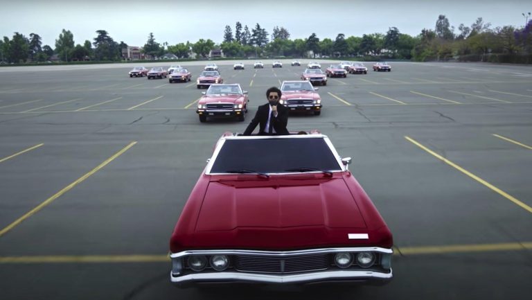 The Weeknd ha iniziato la performance su una convertibile rossa americana, con altre 18 Mercedes Pagoda rosse e bianche che guidavano all’unisono dietro di lui. The Weeknd ha poi abbandonato la propria auto, camminando nel parcheggio mentre quattro camion lo raggiungevano, passandogli accanto di pochi centimetri. Una ripresa aerea ha poi catturato tutti i veicoli che giravano intorno al cantante mentre la telecamera si spostava sempre più lontano. Un video pazzesco, per l’artista che ha vinto 10 premi su 16 candidature, compreso “Miglior artista”, “Miglior artista maschile” e “Top hot 100 song”. Qui sotto il video ufficiale, uno dei più belli a tema automobilistico: