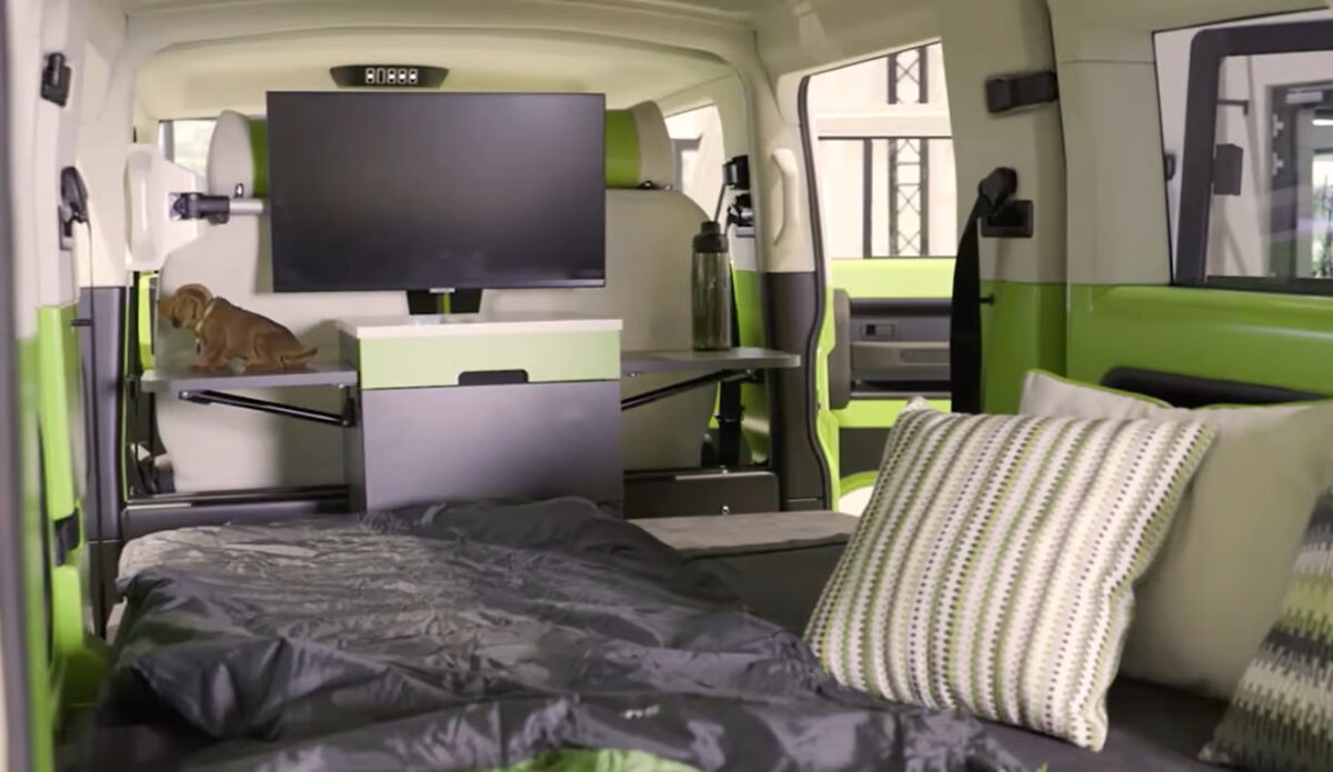 Il tetto a scomparsa manuale è più corto rispetto ai quelli comuni sui camper moderni, ma riesce ad aggiungere altezza direttamente sopra la zona cucina per una cottura più comoda. La piccola cucina comprende un fornello a gas a un solo fuoco nascosto sotto il piano di lavoro estraibile. Nella lista delle attrezzature c’è anche un lavello e un frigorifer. Un paio di piani estraibili si sollevano come ali su entrambi i lati del blocco cucina per aggiungere spazio al bancone, e non manca una tv dietro i sedili anteriori.