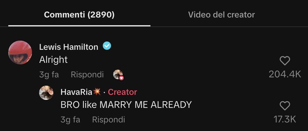 Il campione non si è offeso. Anzi, ha risposto direttamente nei commenti con un secco e ironico “alright”. Il tono scherzoso è stato subito colto dai fan, che hanno riempito il suo commento di reazioni. Non è la prima volta che Hamilton sorprende con la sua presenza social fuori dagli schemi.