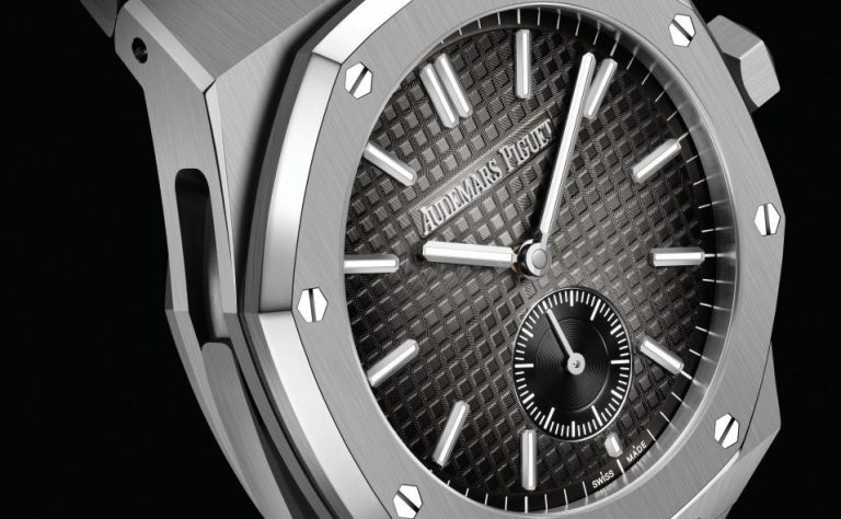 È impreziosito da indici applicati e lancette Royal Oak in oro bianco con rivestimento luminescente per una leggibilità ottimale. Il contatore dei piccoli secondi nero a ore 6 riprende il réhaut, mentre la finitura a chiocciola è in contrasto con il motivo Tapisserie. Il fondello in titanio reca l’incisione “Royal Oak Supersonnerie” e un motivo a onde sonore.