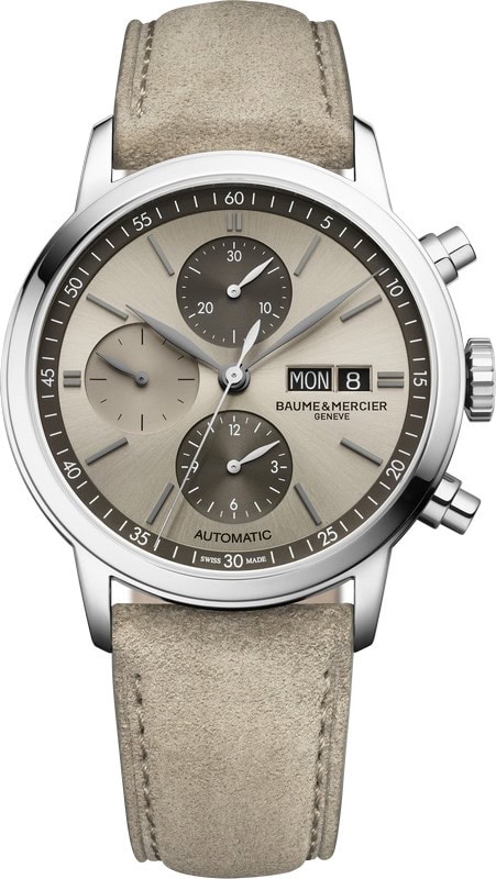 Il Classima con il quadrante color sabbia satinato soleil ha i contatori antracite e sabbia per il cronografo e i piccoli secondi. I contatori a ore 12 e 6, in antracite, si abbinano al réhaut dello stesso colore, creando un effetto stilistico di contrasto e armonia. Gli indici rivettati e le lancette a foglia sono in rutenio, mentre la lancetta dei secondi cronografici ha un’estremità bianca per maggiore chiarezza. La cassa rotonda in acciaio inossidabile lucido da 42 mm di diametro e 13,2 mm di spessore è protetta da un vetro zaffiro antigraffio. Il movimento automatico offre una riserva di carica di 48 ore e un’impermeabilità fino a 5 ATM. Il cinturino intercambiabile in vitello nabuk color sabbia con impunture tono su tono si chiude con una doppia fibbia pieghevole in acciaio inossidabile con pulsanti di sicurezza.