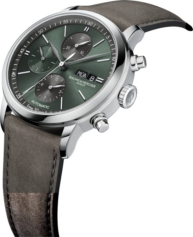 Il Classima combina un quadrante verde con finitura satinata soleil e un réhaut color ardesia con contatori verdi e ardesia per il cronografo e i piccoli secondi. Gli indici rodiati rivettati e le lancette a foglia in rutenio conferiscono un’estetica raffinata. La lancetta dei secondi cronografici ha un’estremità bianca per una migliore leggibilità. Il giorno e la data sono posizionati a ore 3. La cassa in acciaio inossidabile lucido da 42 mm di diametro e 13,2 mm di spessore è protetta da un vetro zaffiro antigraffio, con un fondello personalizzabile con incisione. Il movimento automatico offre una riserva di carica di 48 ore e un’impermeabilità fino a 5 ATM. Il cinturino intercambiabile in pelle di vitello nabuk marrone-grigio con impunture tono su tono si chiude con una doppia fibbia pieghevole in acciaio inossidabile con pulsanti di sicurezza.