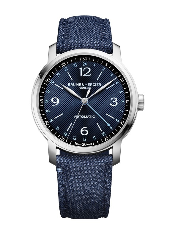 Ogni indicazione oraria si integra con grande armonia nel quadrante, perfettamente leggibile pur facendo risaltare ogni informazione con discrezione, grazie a contrasti cromatici e dimensioni differenti. Di colore blu satinato con decoro soleil, evidenziato da un réhaut nero e una minuteria bianca, è decorato da linee diagonali che evocano i motivi di un tessuto. Bianchi anche cifre arabe e indici. Le lancette a foglia di ore, minuti e secondi sono rodiate, mentre la lancetta centrale GMT è blu.