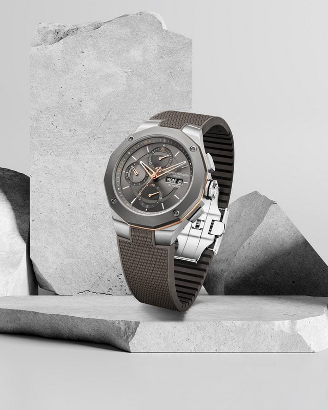 Il modello è accompagnato da un cinturino integrato in caucciù grigio motivo tela, dotato di tripla fibbia pieghevole con fermaglio di sicurezza e regolazione di facile utilizzo e dell’affidabilissimo sistema di intercambiabilità Baume & Mercier, che consente di sostituirlo in pochi secondi senza attrezzi particolari.