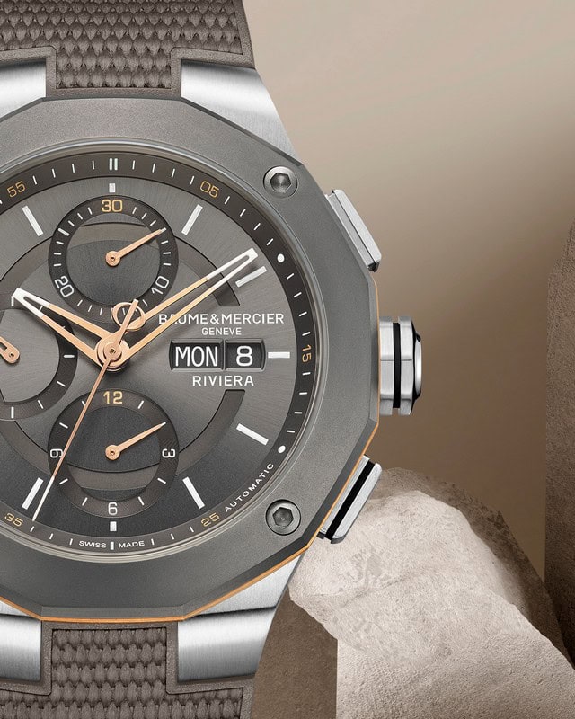 Baume & Mercier cronografo Riviera: nato nel 1973 e recentemente reinterpretato, l’orologio Riviera esprime il savoir-faire della Maison nell’ambito del design e dell’accostamento dei materiali. Icona lifestyle di Baume & Mercier, questo segnatempo dalle linee pure ed essenziali, riconoscibile per la lunetta dodecagonale, afferma oggi la sua piena maturità, declinandosi ora in una versione cronografo sporty-chic e bicolore da 43 mm di diametro dal look estremamente deciso.