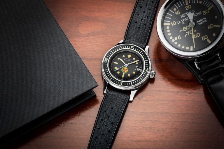 L’orologio è dotato di un cinturino in caucciù del tipo «Tropic», un materiale molto popolare fra i subacquei dell’epoca grazie alla sua resistenza nel tempo e il confort quando indossato. Attraverso questa serie limitata, Blancpain restituisce la lettera di nobiltà a uno strumento culto del suo passato in veste di fornitore delle forze navali di numerosi eserciti in tutto il mondo.