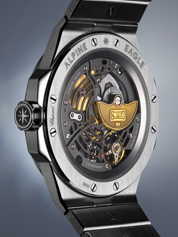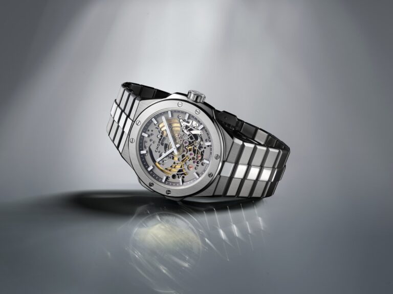 L’assenza del quadrante permette di rivelare i dettagli del meccanismo. La platina e i ponti sono traforati che creano spazi concentrici attorno al centro del movimento, con finiture sabbiate che contrastano con le superfici satinate e lucide della cassa e del bracciale. Questa estetica tecnica, inedita per l’Alpine Eagle, è resa possibile dall’expertise di Chopard Manufacture.