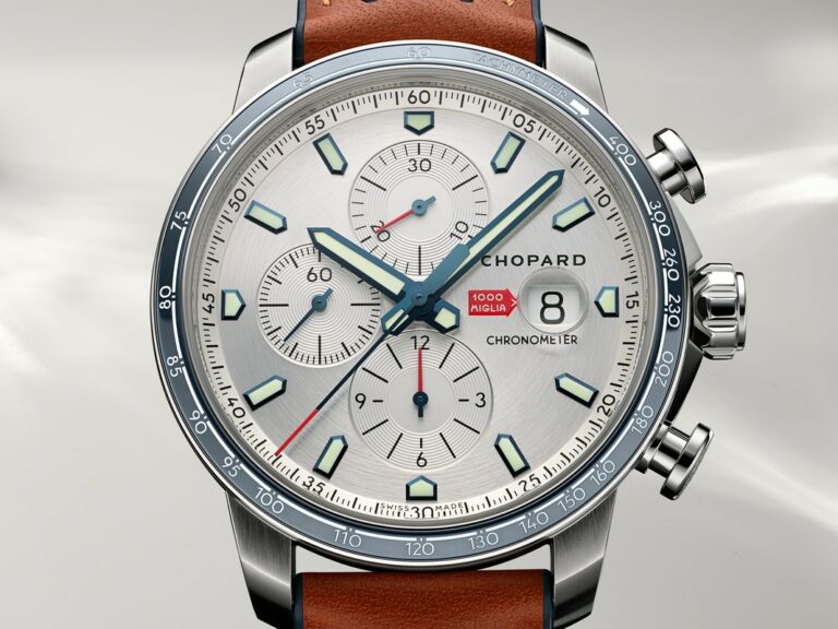 Il modello Chopard Mille Miglia 2022 Race Edition è un omaggio, sempre rinnovato e sempre leggermente diverso, alla “Corsa Più Bella del Mondo”. Il segnatempo si differenzia dalle precedenti edizioni della collezione per diversi dettagli, in primis il quadrante grigio-argento caratterizzato da una sottile satinatura circolare e dall’uso di un blu intenso per le lancette, gli indici e l’inserto della lunetta.