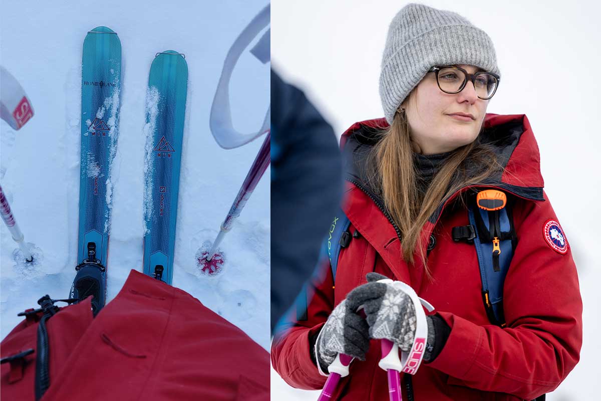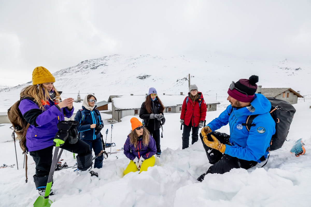 Si parte con la cosa più importante: teoria e pratica di quella che chiameremo mitigazione del rischio, perché in montagna è impossibile esserne totalmente esenti. Tra le tante nozioni abbiamo appreso come valutare le condizioni meteo prima della partenza e quali sono gli strumenti più validi (come Meteoblu o Windy per il vento) e come riconoscere i diversi manti nevosi per calcolare meglio il rischio di valanghe. Finita la teoria si montano le pelli e prepara lo zaino per la prova pratica.