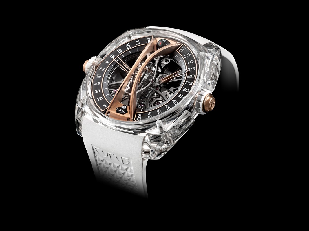 La sua trasparenza consente una visione completa del movimento da tutte le angolazioni e lascia agli appassionati il piacere di poterne apprezzare tutti i suoi straordinari dettagli. Composta da un totale di 29 parti (i componenti in vetro zaffiro sono il corpo cassa con le