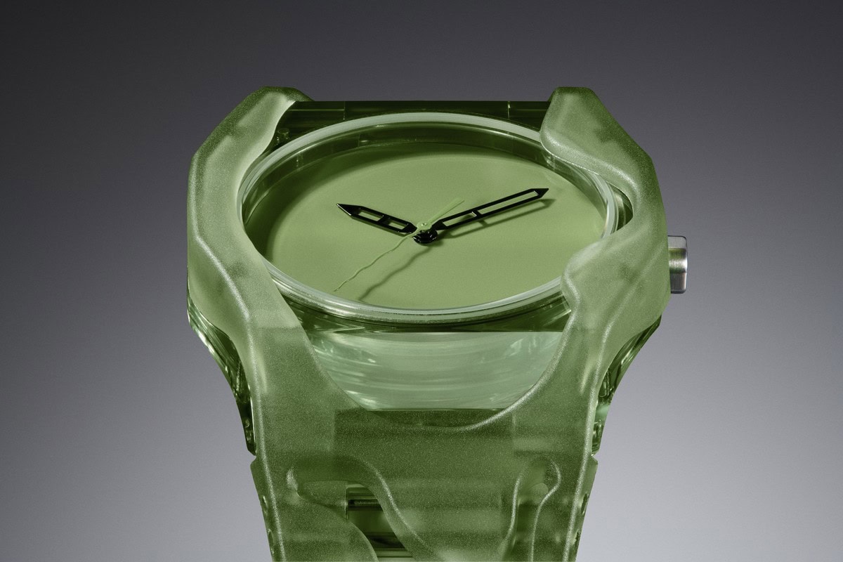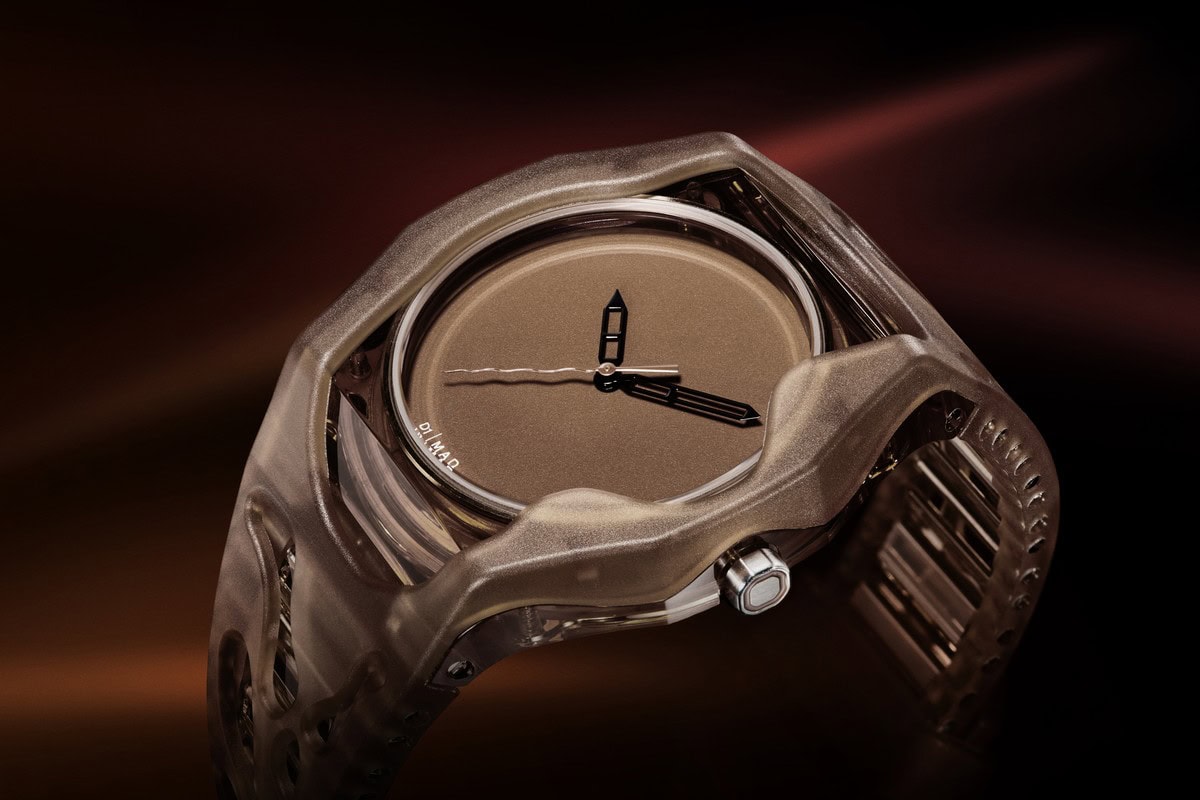 Il modello presenta una cassa trasparente da 39mm avvolta da una cover in nylon fluido, una membrana tecnica che scorre lungo tutto il bracciale, lasciando visibili i dettagli metallici. Le lancette a contrasto si stagliano sul quadrante materico senza indici, mentre le viti a vista, la corona e il case back in acciaio contrastano nettamente con il nylon, risultando in un accessorio d’avanguardia.