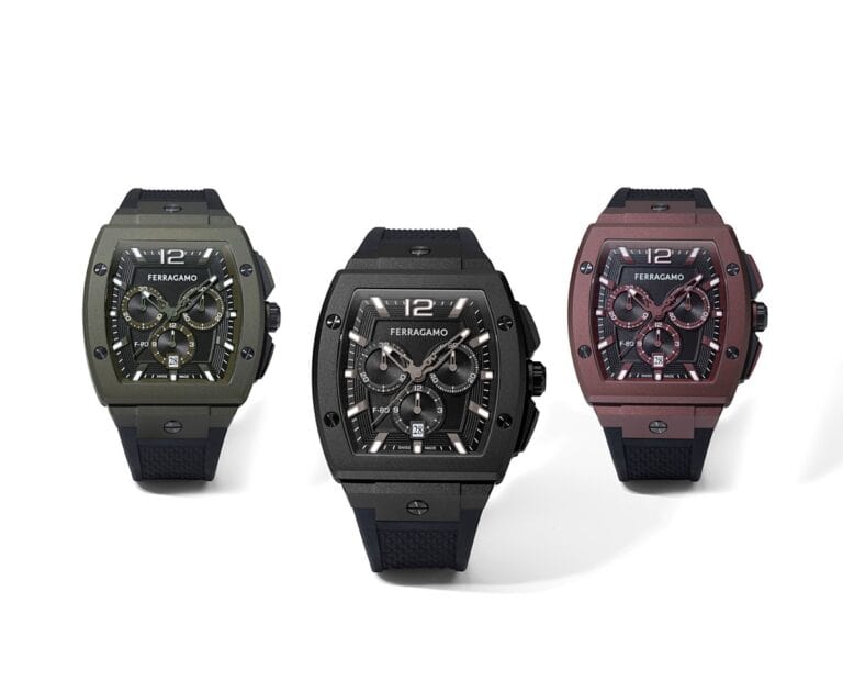 Ferragamo sceglie una gamma cromatica di toni intensi — nero, verde e bordeaux — che rafforza l’identità del modello e ne definisce il taglio contemporaneo. Sul piano funzionale, indici e lancette luminescenti garantiscono una lettura chiara anche quando l’illuminazione cala, mantenendo l’orologio pratico nell’uso quotidiano.