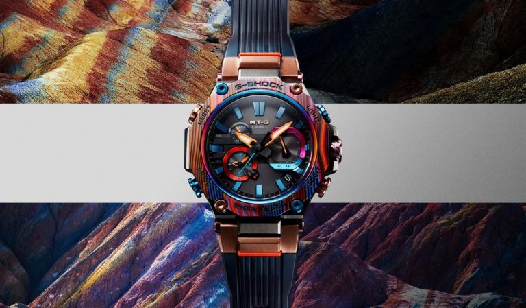 La lunetta dell’MTG-B2000XMG è realizzata tramite un nuovo processo che prevede la laminazione del carbonio con fibre di vetro colorate. Questo processo consente di ottenere una lunetta multicolore con un disegno multistrato che ricorda la colorazione mistica della Rainbow Mountain caratterizzata da strati di colori diversi dovuti all’ossidazione dei minerali che si sono accumulati nel tempo a seguito dell’attività vulcanica e dei movimenti tettonici.
