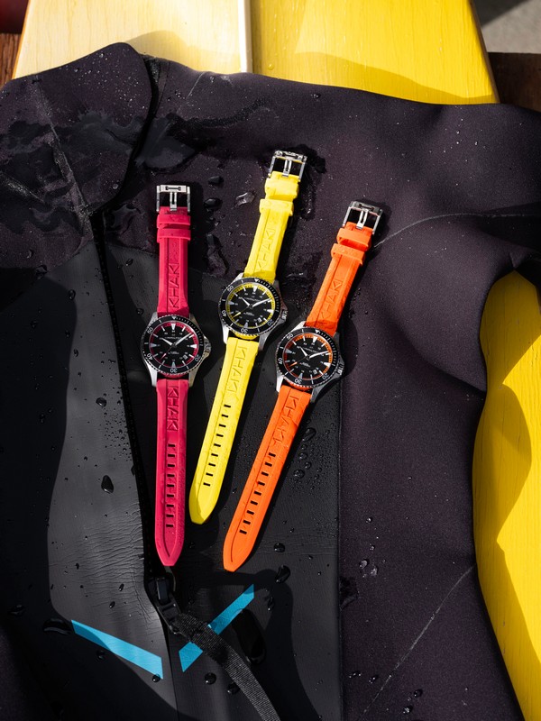 Hamilton presenta le ultime novità della collezione Khaki Navy Scuba 2024 con tre nuove colorazioni ispirate al mare e alla spiaggia: arancione, giallo brillante e rosso.