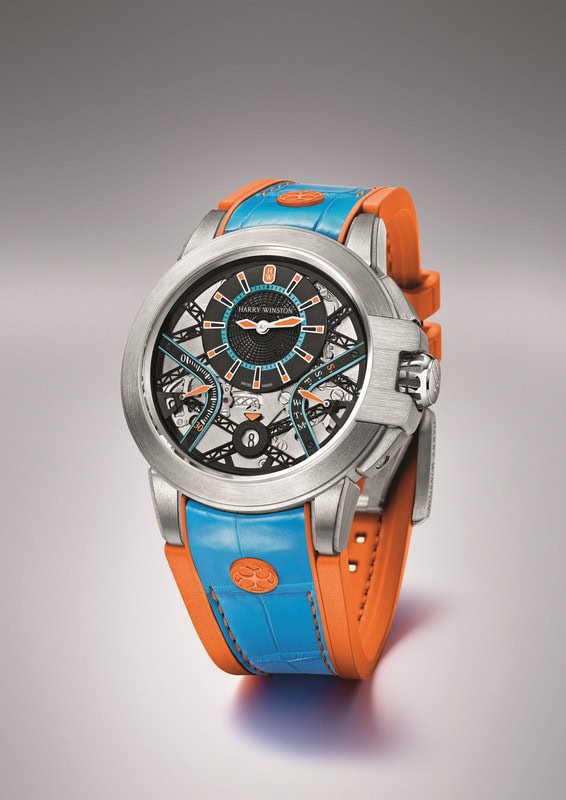 La collezione Ocean di Harry Winston si distingue per le sue ore e minuti decentrati e display retrogradi, che presentano una dinamica combinazione bicolore di colori vivaci. Le varianti di colore, da quella turchese con accenti arancioni a quella verde neon con contrasti neri opachi, fino al modello bianco con tocchi blu navy, sono pensate per catturare l’attenzione e riflettere la personalità audace del proprietario. In sintonia con la natura sportiva dell’orologio, gli indici applicati, le lancette delle ore e dei minuti e persino l’applicazione di smeraldi Harry Winston in oro 18 carati a mezzogiorno sono luminescenti.