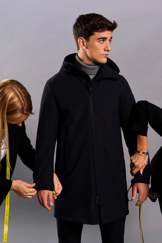 - Giacca elasticizzata in leggero cotone per l’uomo e A-shape in nylon stretch ultraleggero 20 denari per la donna, entrambi con toppe ad H
