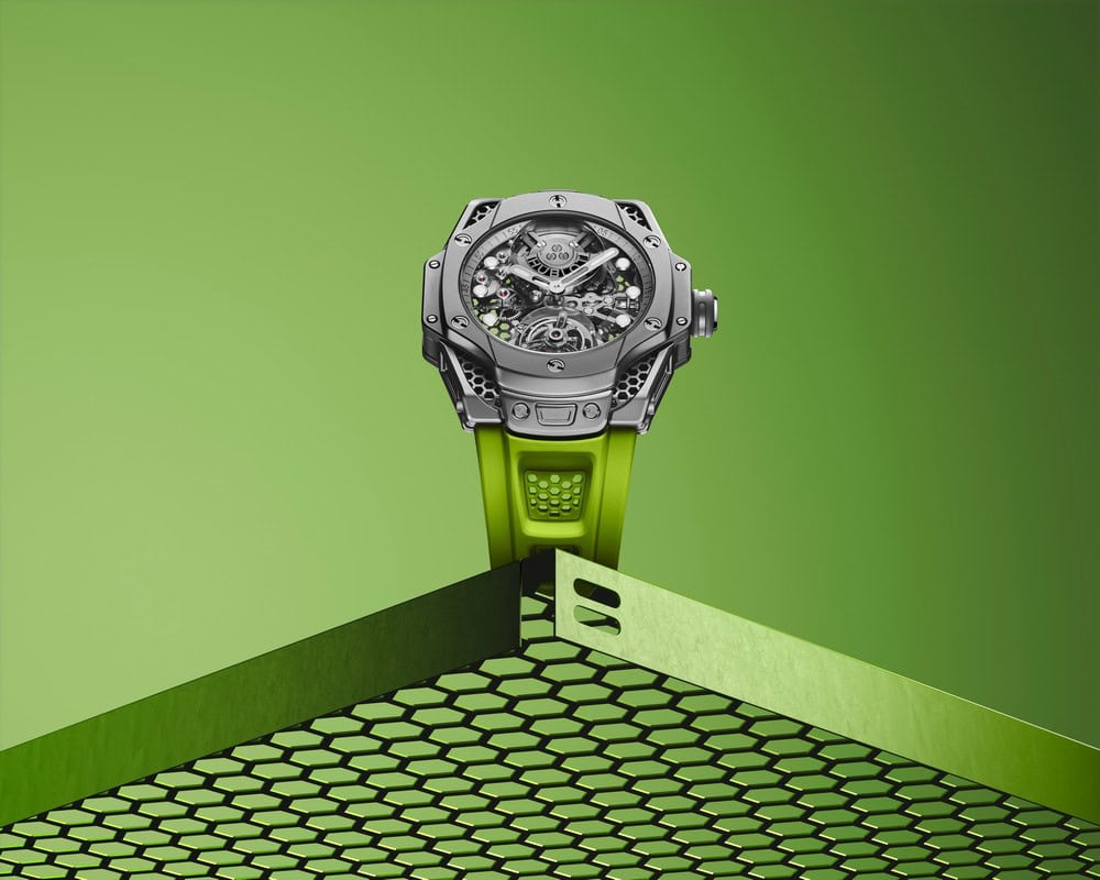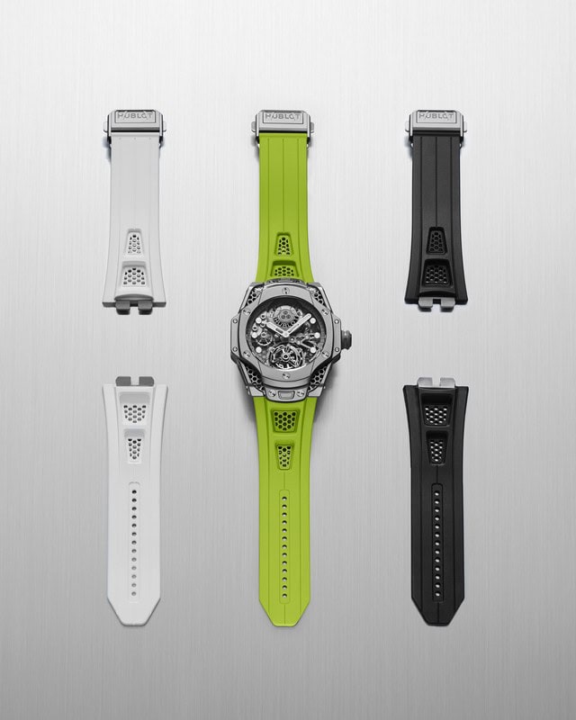 Per sottolineare il suo aspetto industriale, Ross ha voluto rivestire in titanio micropallinato lucido tutti i componenti della cassa fino alla fibbia, che presenta un’incisione ruvida a laser del logo Hublot. Per esaltare il look monocromatico grigio la corona è sovrastampata in caucciù grigio, mentre il ponte del tourbillon appare ora in una tonalità neutra che consente di abbinare facilmente l’orologio a uno dei tre cinturini lisci in caucciù pieno nei colori nero, bianco o nelle vibrazioni pop del verde elettrico.