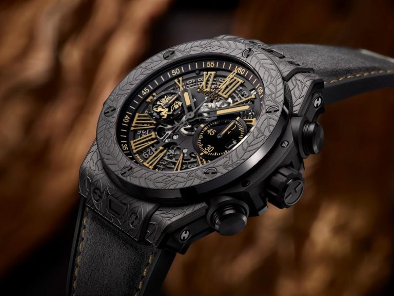 Iniziando dalla cassa da 44 mm di diametro in ceramica nera incisa, su cui spicca il motivo della foglia di tabacco che danza al ritmo della brezza di montagna, uno degli elementi chiave per la famiglia Fuente. La cassa racchiude il famoso movimento di manifattura Unico calibro HUB1242, un cronografo flyback con 72 ore di riserva di carica.