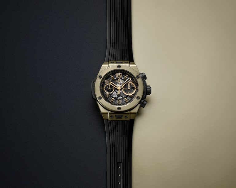 Hublot Big Bang Unico Full Magic Gold: la manifattura che ama sorprendere, inventare ed innovare torna alle origini. Cassa iconica da 44 mm, costruzione a “sandwich”, grandi pulsanti, lunetta con 6 viti a vista “non allineate”, protezioni di cassa e pulsanti, quadrante scheletrato, cinturino in caucciù intercambiabile mediante l’esclusivo sistema One Click.