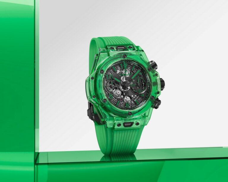 Il Big Bang Unico Green Saxem di Hublot rappresenta un’importante innovazione nel mondo dell’orologeria, grazie al suo materiale rivoluzionario, il Saxem appunto, che supera la brillantezza dello zaffiro mantenendone la resistenza.