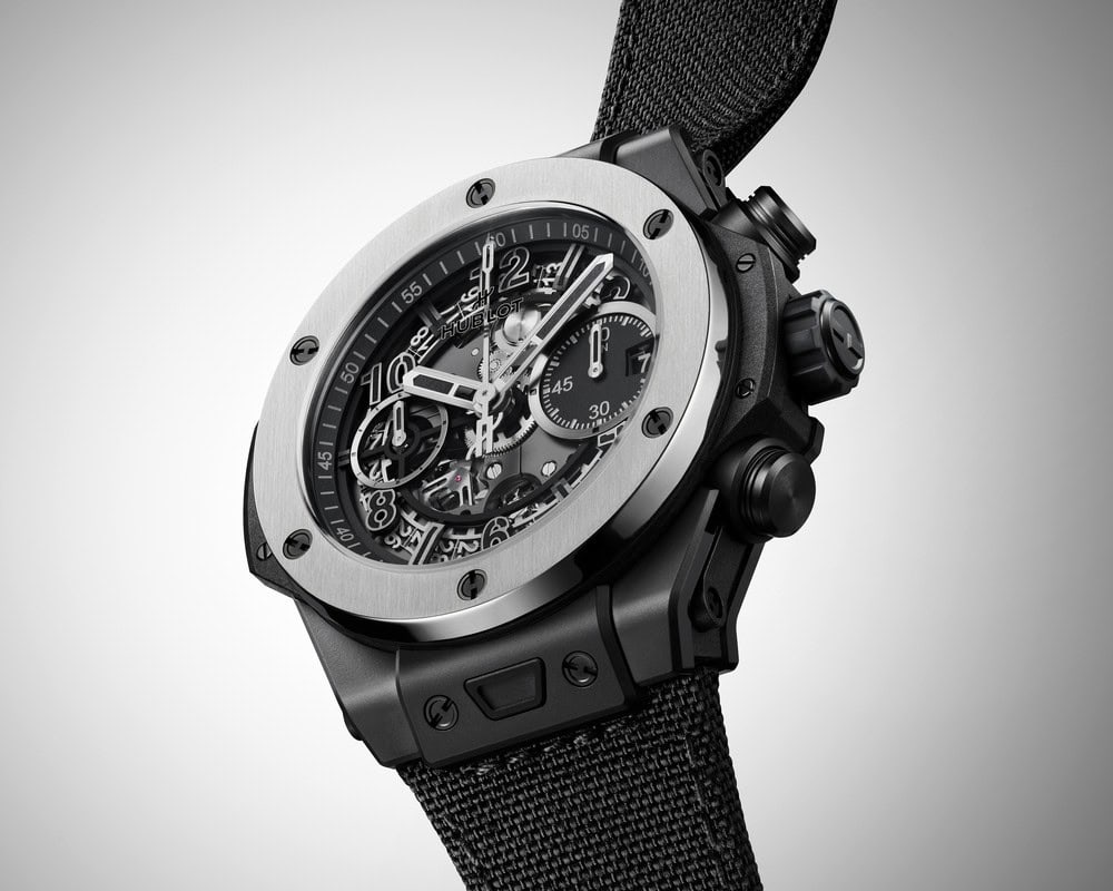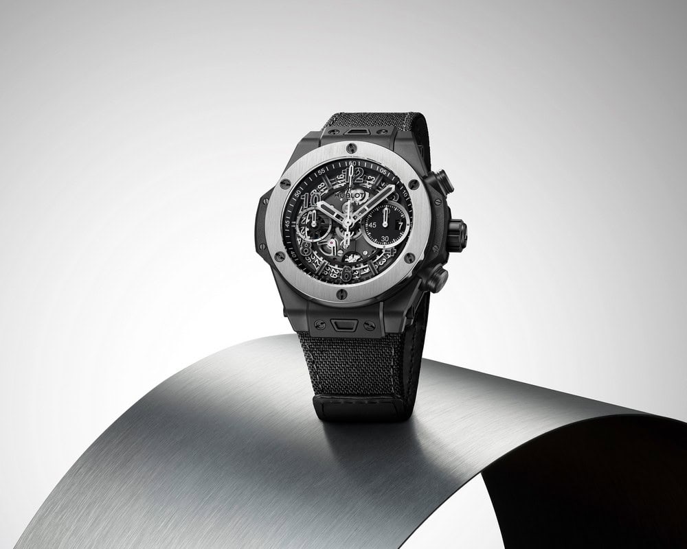 Il quadrante nero opaco offre una visuale perfetta del calibro di manifattura HUB1280, un movimento cronografico flyback a carica automatica con una riserva di carica di 72 ore. Gli appassionati di orologeria apprezzeranno la complessa meccanica visibile attraverso il vetro zaffiro antiriflesso, dove numeri e indicazioni si fondono in una leggibile armonia bicolore. Inoltre, il disco del calendario offre una vista dinamica che complemente la funzionalità estetica dell’orologio.