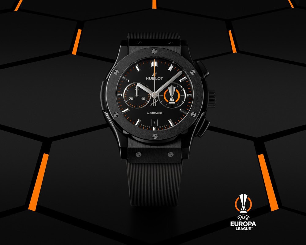 Hublot Classic Fusion Chronograph UEFA Europa League Ceramic: da quasi 10 anni, il marchio svizzero d’alta orologeria assiste alle partite della UEFA Europa League direttamente da bordo campo in qualità di Official Watch. In collaborazione con l’ente governativo del calcio europeo, Hublot presenta ora il Classic Fusion Chronograph UEFA Europa League Ceramic.