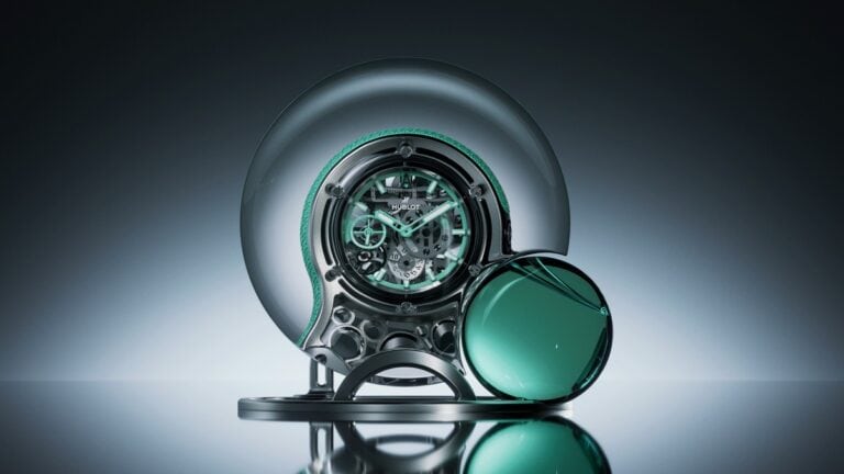 Il design, caratterizzato da una costruzione a sandwich con vetri bombati a forma di goccia e la cassa aperta in titanio, assomiglia a un delicato pizzo. Gli ammortizzatori laterali in caucciù, personalizzati nel colore Arsham Green, riportano il monogramma dell’artista. La cassa, dotata di 17 O-ring, garantisce una perfetta impermeabilizzazione, mentre gli iconici elementi di design di Hublot, come le sei viti a forma di H, completano l’estetica del segnatempo.