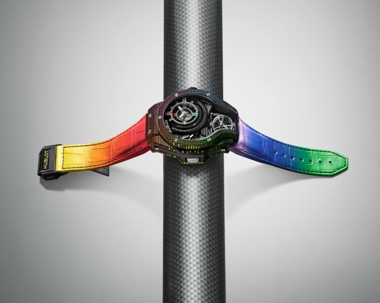 Il “MP-09 Tourbillon Bi-Axis 5-Day Power Reserve” è una creazione 100% Hublot e riprende l’iconico motivo Rainbow per proiettarlo nel XXI secolo. Per questo modello la Maison ha dovuto reinventare tutto: il concetto, il metodo, gli strumenti, i materiali e tutte le gamme di colori associate.