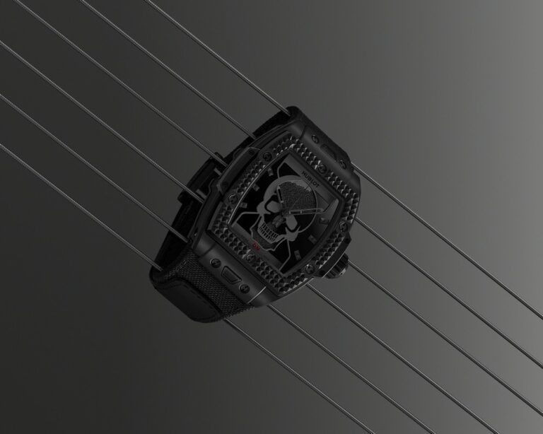 Lo Spirit of Big Bang Depeche Mode, presentato a Berlino, 11 anni dopo il primo evento congiunto della collaborazione nella capitale tedesca, è una celebrazione dell’estetica All Black di Hublot, caratterizzata da una cassa a tonneau di 42 mm in ceramica nera sabbiata e satinata. Al centro si trova un teschio circondato da una clessidra, simboli che evocano il concetto di Memento Mori, espressione latina che significa “ricordati che devi morire”, invitando alla riflessione sulla transitorietà della vita. Il quadrante presenta piccole sfere di ceramica nera che, muovendosi con il polso, simboleggiano il fluire del tempo, mentre gli indici si alternano tra il logo DM della band e borchie piramidali, richiamando il motivo rock della lunetta.